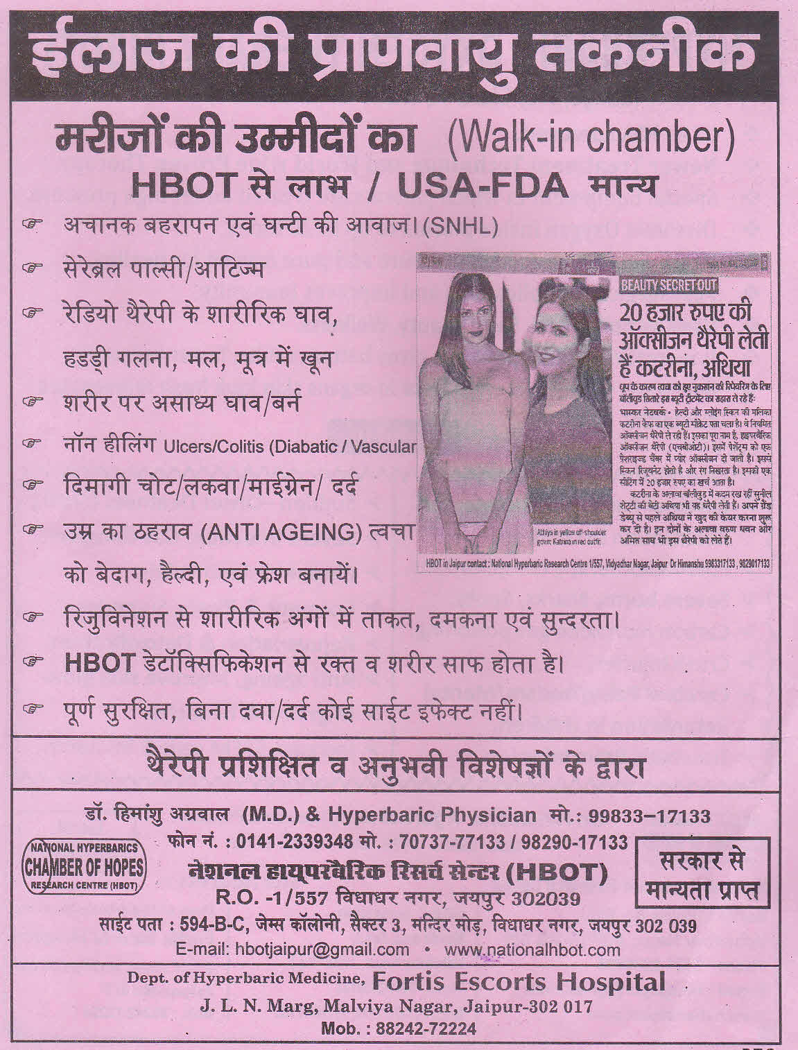 Fortis Hospital has now started Mild Hyperbaric Oxygen Rejuvenation for 30 minutes at 1100/- for Two persons to get Pure Medical Oxygen and lessen effect of Pollution now prevalent.A good way of life to get Oxygen periodically at affordable cost